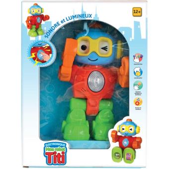 Jambes et bras articulés, 2 bouliers sous les pieds lui permettent de se déplacer. Les boutons déclenchent différentes actions, des sons et des lumières. H 21 cm. Alim 3 piles LR03/AAA incluses. Dès 12 mois.