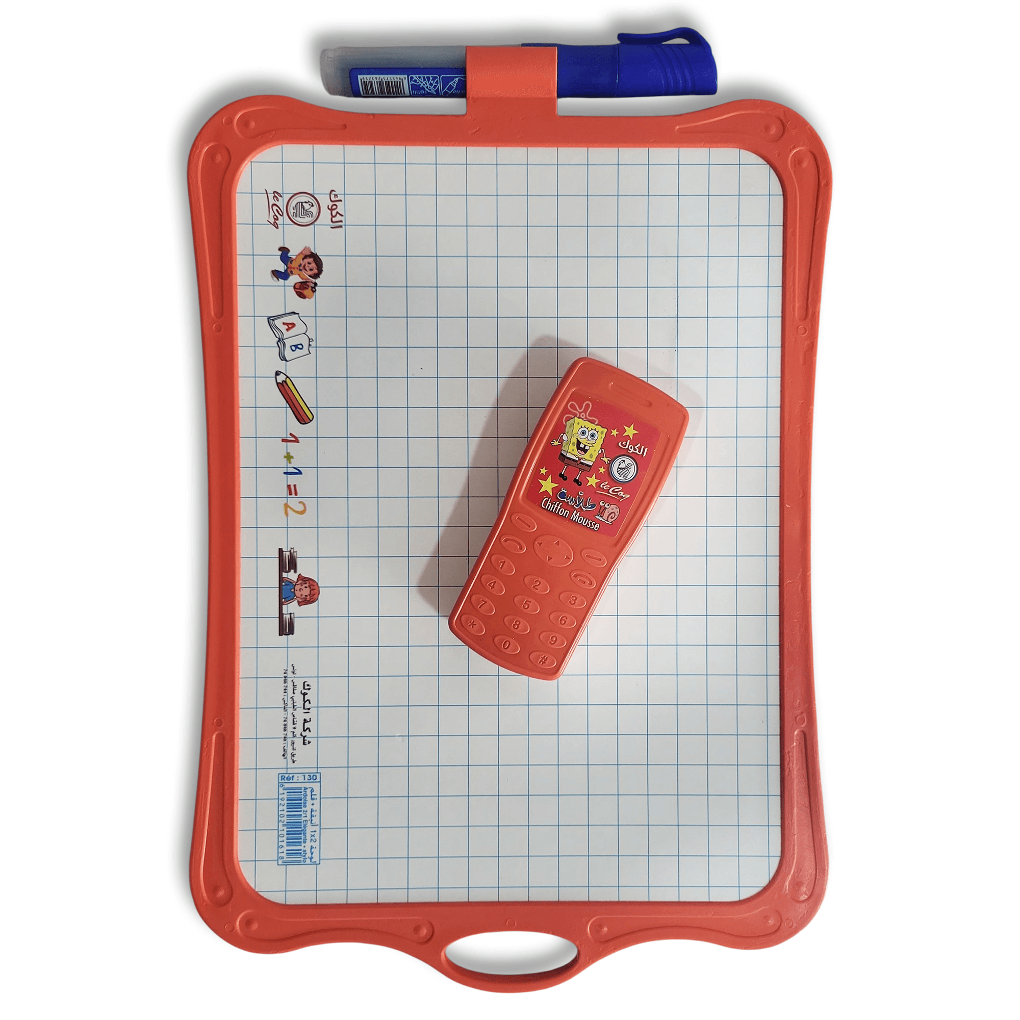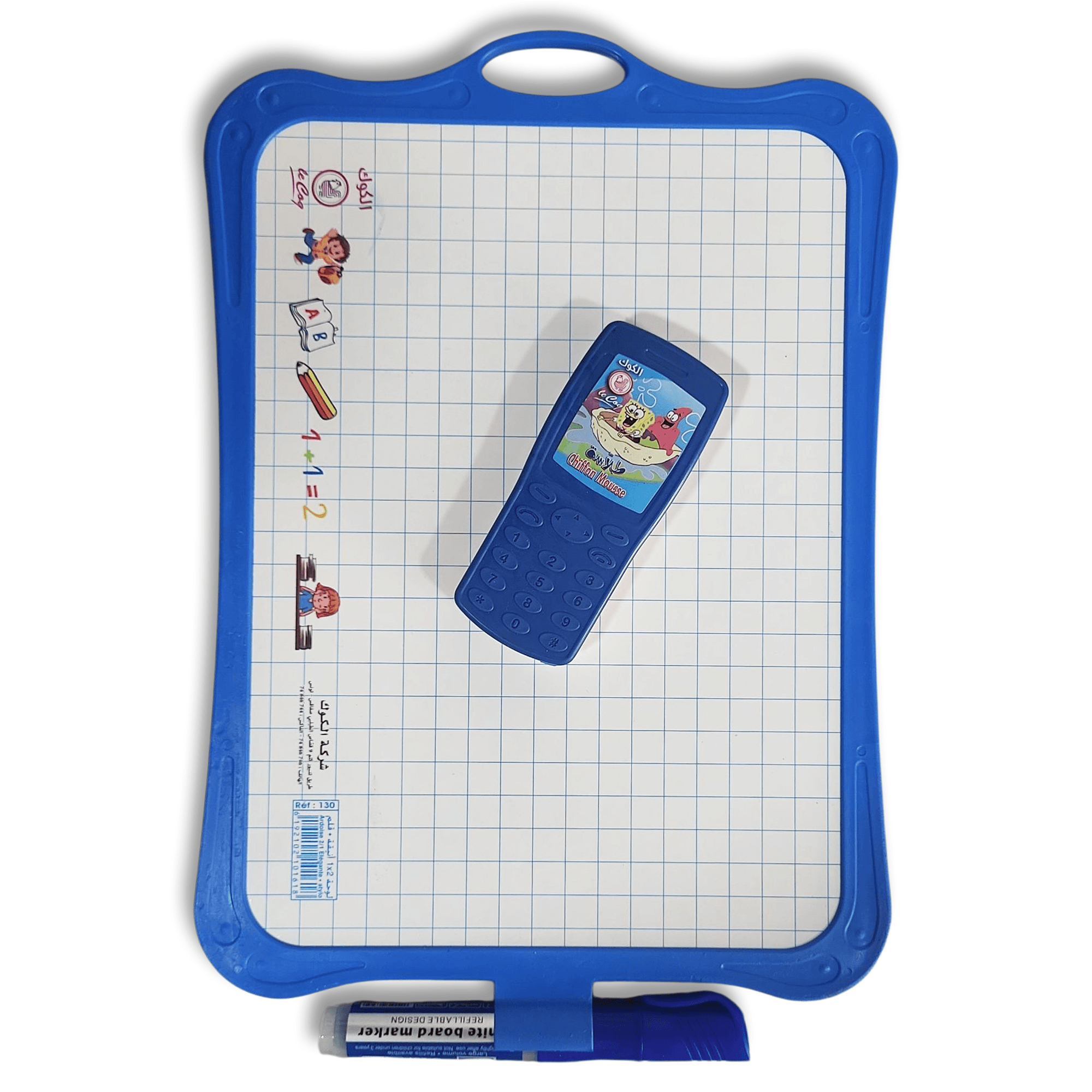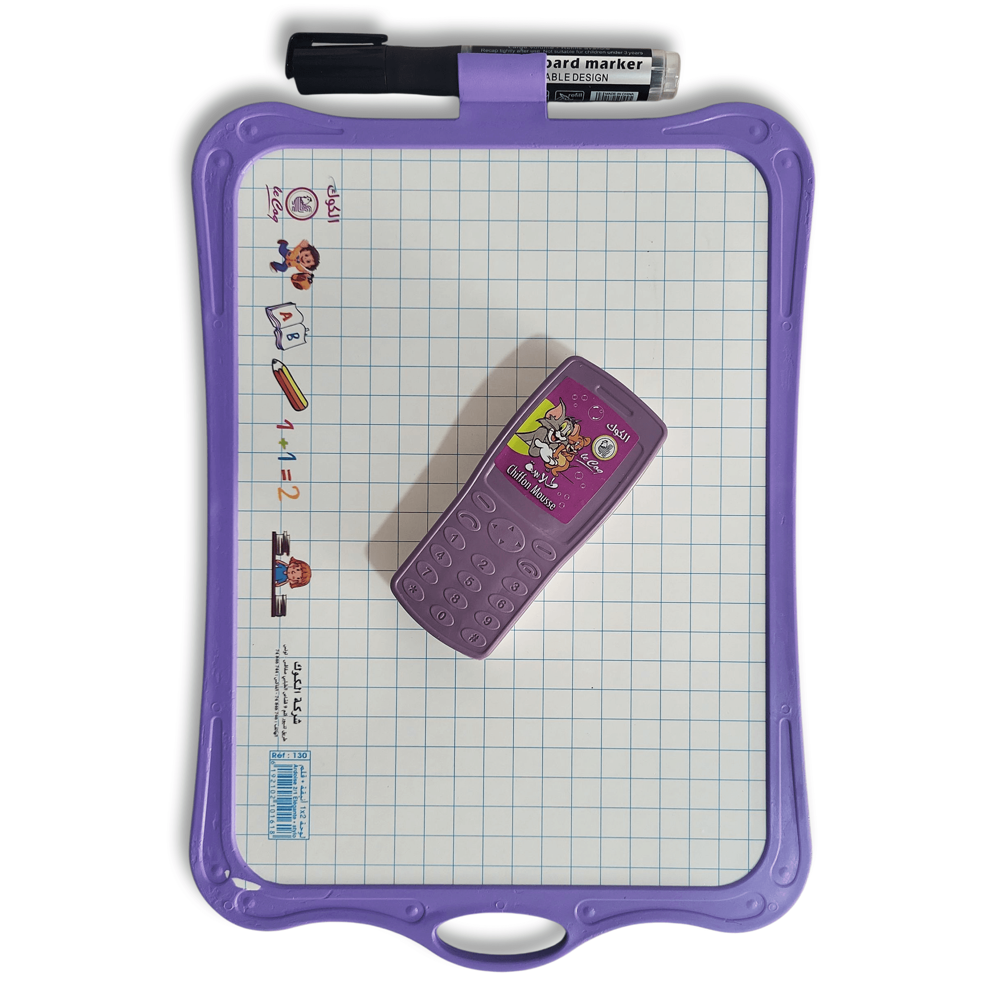 Ardoise 2 en 1 double-face : surface effaçable pour feutres et face foncée pour écritures/crayons. Portable, légère, avec poignée. Disponible en jaune, violet, bleu, vert et orange.