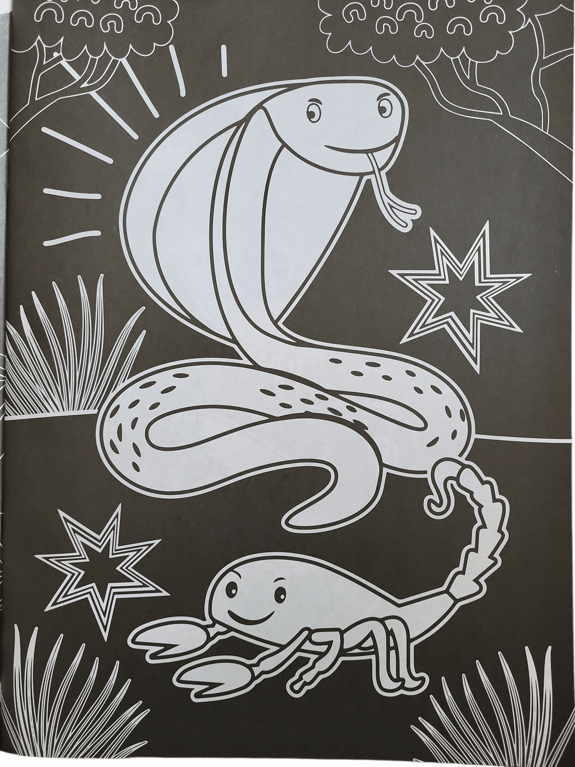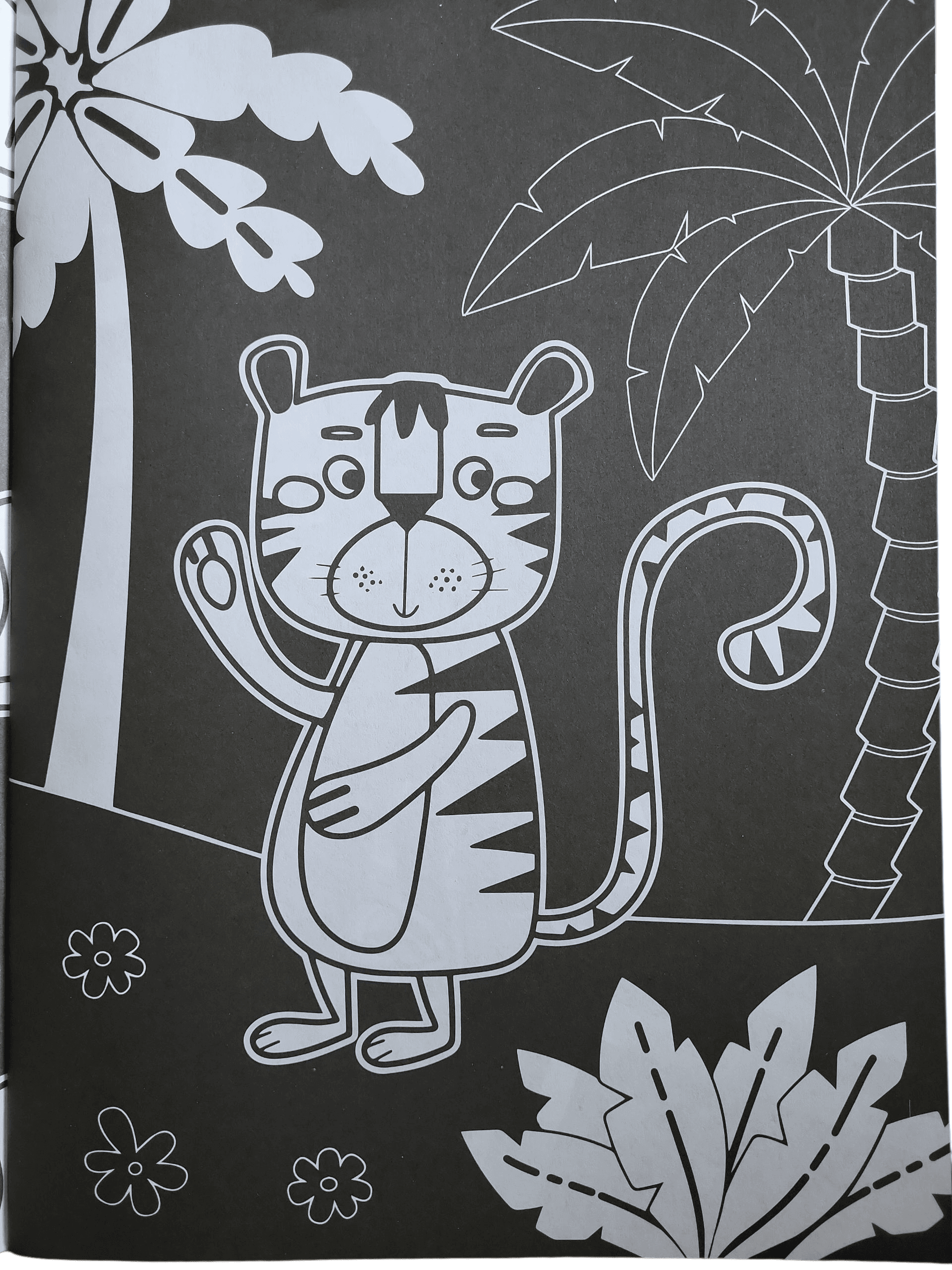 • 16 pages A4 — illustrations jungle imprimées en contours blancs sur pages noires.