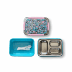 Lunchbox avec plateau inox 304 et 3 compartiments, joint anti‑fuite et clips de fermeture — solution hygiénique et pratique pour les repas en déplacement.