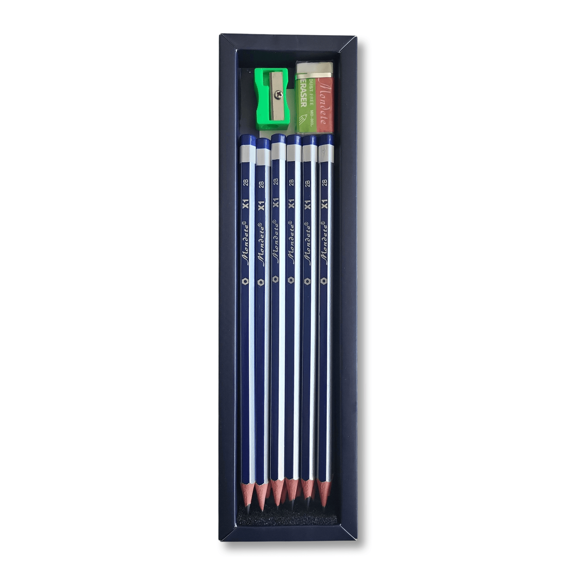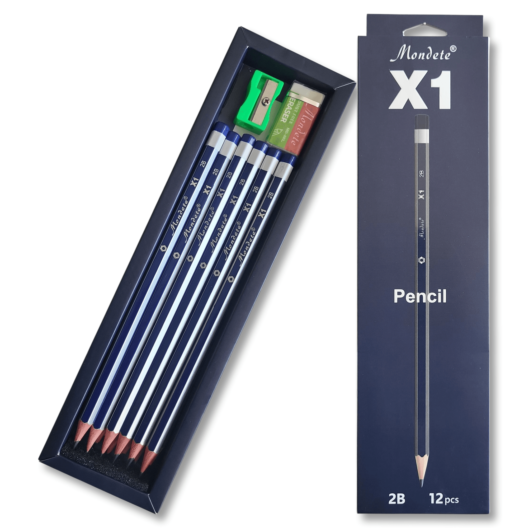Coffret de 12 crayons graphite 2B bleu Mondelete X1 avec gomme et taille-crayon — kit complet pour l’écriture,